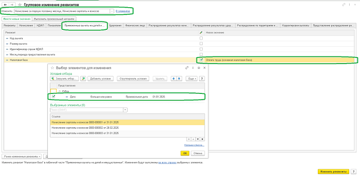 Еще одним вариантом заполнения данного реквизита является групповое изменение реквизитов. Такой вариант подходит только в том случае, если у вас один вид налоговой базы, то есть районный коэффициент не начисляется и в отдельную базу не выделяется. Обработка находится в разделе "Администрирование" — "Обслуживание" — "Корректировка данных" — "Групповое изменение реквизитов". В обработке можно отобрать документы с датой выплаты в 2025 году. На вкладке «Примененные вычеты на детей и имущественные» выбрать вид изменяемого поля и его новое значение, как показано на рисунке.