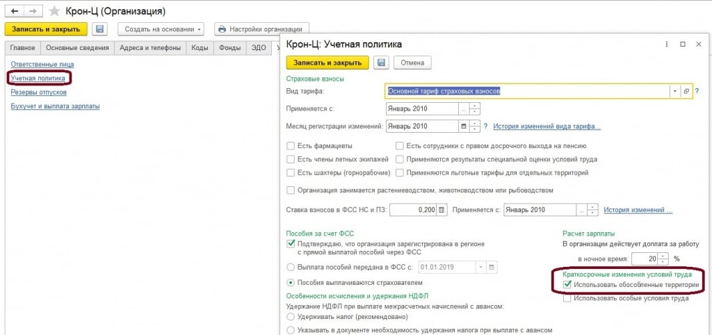 Бывают, такие ситуации, когда сотрудник числится в одном подразделении, а НДФЛ должен учитываться по другой регистрации в ИФНС. Чтобы такое реализовать в программе, потребуется подключить дополнительный функционал «Территорий», для этого открываем карточку организации — Учетная политика и другие настройки — Учетная политика — флажок «Использовать обособленные территории».