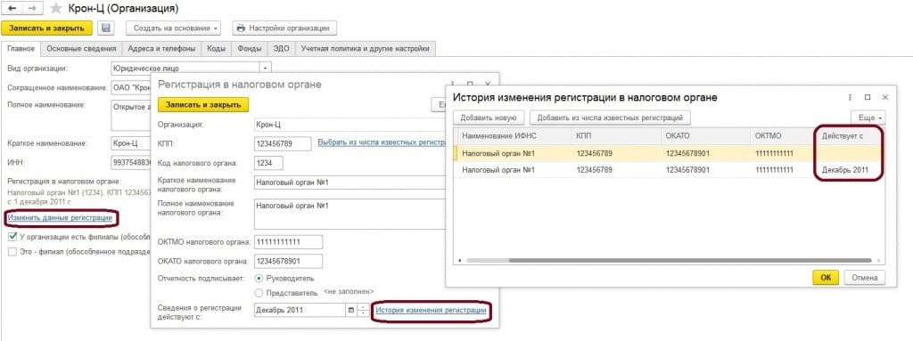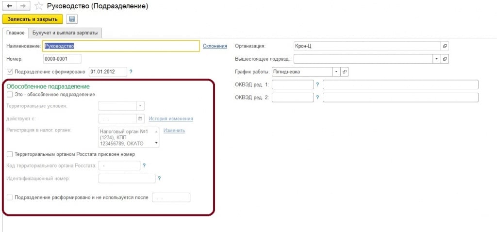 ИНН, сведения о регистрации в ИФНС и другие сведения используются при составлении отчетности. В случае обособленного подразделения, есть такая возможность в карточке подразделения:
