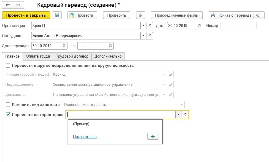 Указать необходимую территорию сотруднику можно разными документами, например, сразу при приеме на работу, либо кадровым переводом, либо перемещением между территориями. После этого, все движения по НДФЛ будут собираться по нужной нам ИФНС.