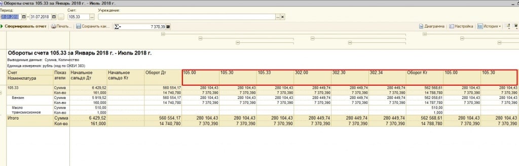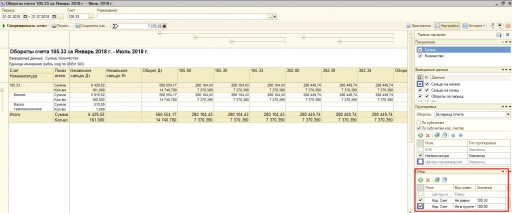 Видим, что сверху выведены все счета, с которыми корреспондирует счет 105. Для того, чтобы убрать из отчета внутренние перемещения материалов нужно в настройках, установить отбор.
