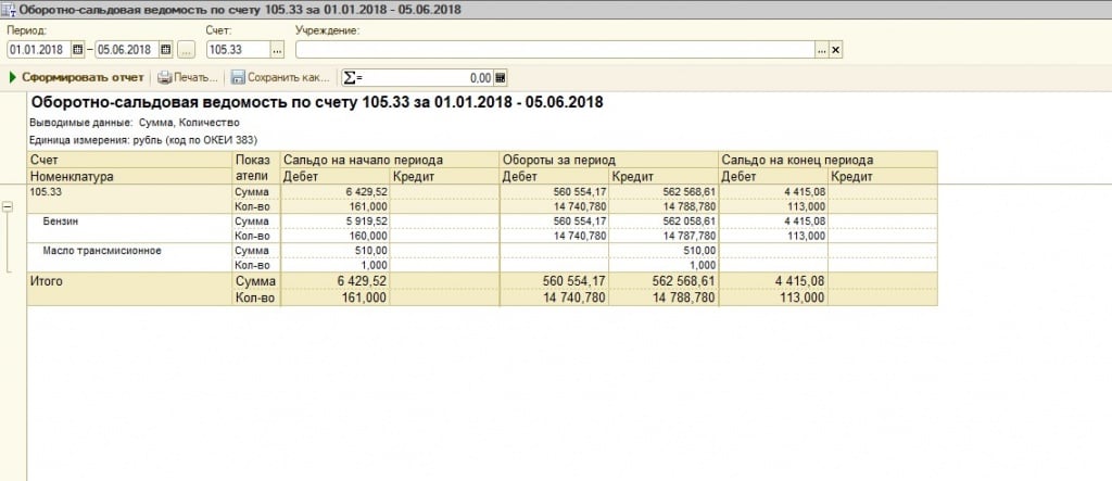 Видим, что счета 105 «ушли», и в отчете остались данные по поступлению и выбытию без перемещений.