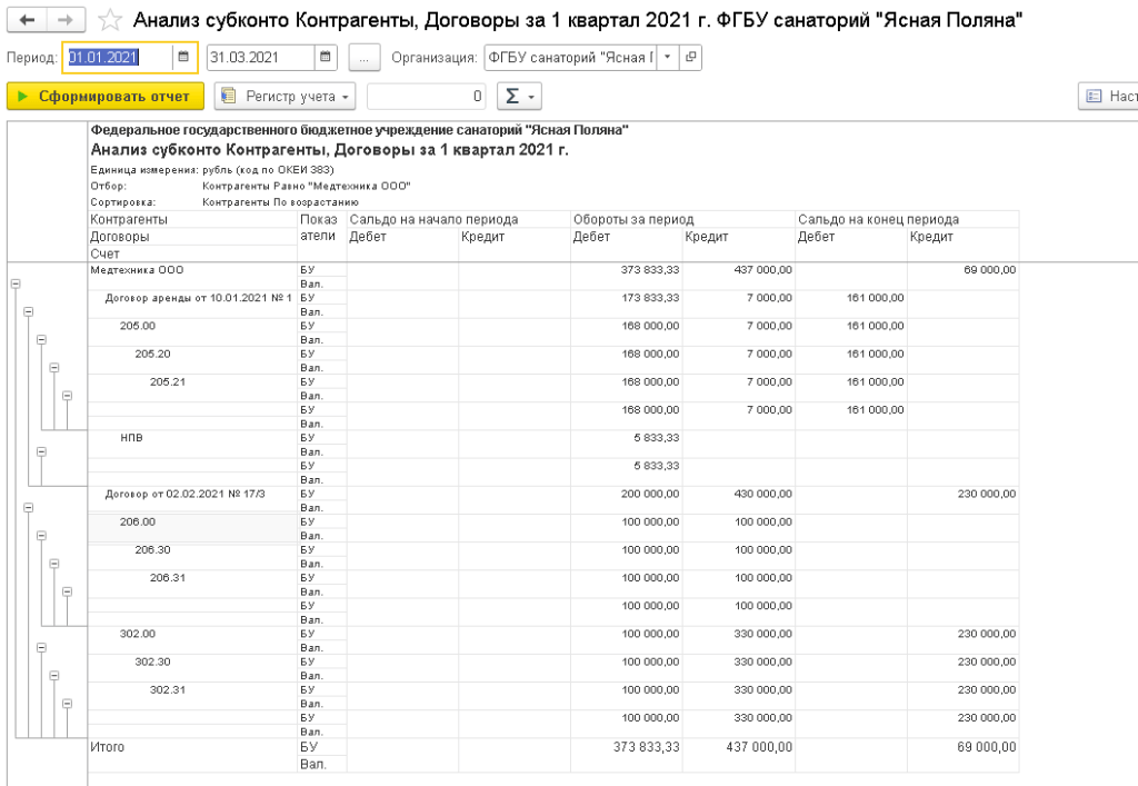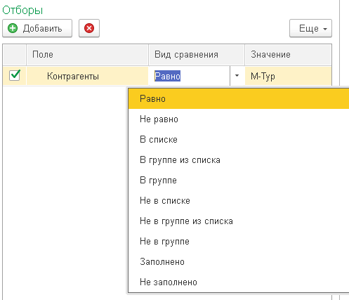 Например, необходимо просмотреть, по каким договорам проходит контрагент – Медтехника ООО. Делаем настройки: