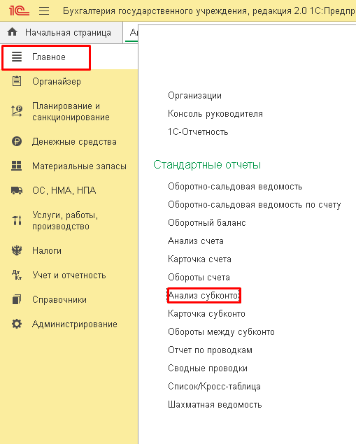 Отчет находится в Стандартных отчетах, выбираем раздел Главное, далее разделы: «Планирование и санкционирование», «Денежные средства», «Материальные запасы», «ОС, НМА, НПА» и т.д.