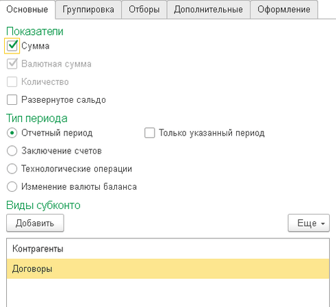 Кроме того, настройки отчета позволяют задать вывод оборотов по субсчетам, а также вывод данных по валютам и по количеству для тех счетов, на которых предусмотрено ведение валютного и, соответственно, количественного учета.