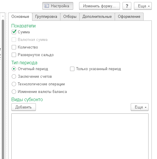 В разделе Настройка есть вкладки Основные, Группировка, Отборы, Дополнительные и Оформление.