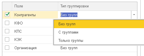 Только группы – будут выходить только наименования групп, в которую входит Контрагент.