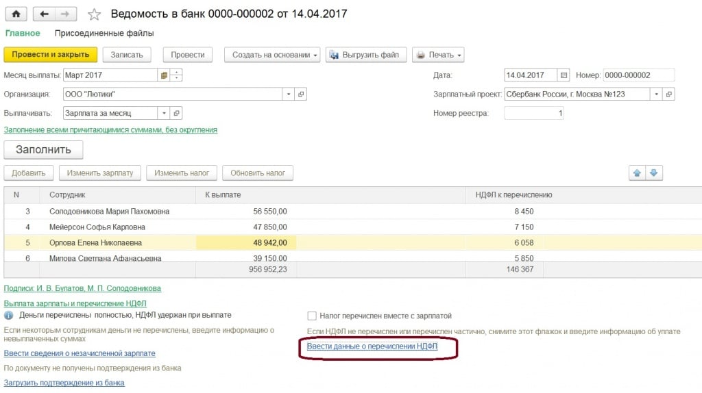 Есть возможность убрать данный флажок в ведомости, тогда по появившейся гиперссылке, можно создать документ "Перечисление НДФЛ".