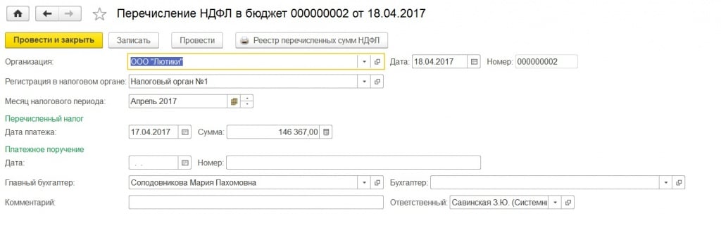 В нашем примере зарплата за март, выплачивалась 14 апреля, следовательно, крайний срок перечисления НДФЛ будет 17 апреля, первый рабочий день после выходных.