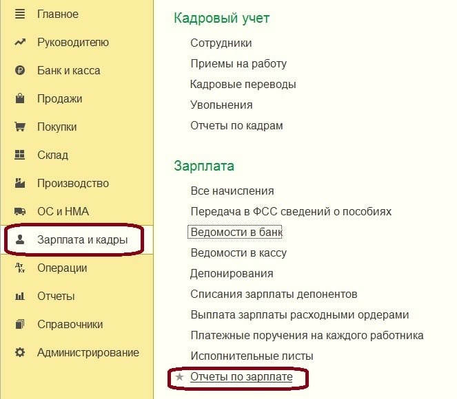 Как формируется этот отчет и как его трактовать, посмотрим на зарплатной конфигурации. Здесь он располагается в разделе "Налоги и взносы", "Отчеты по налогам и взносам".