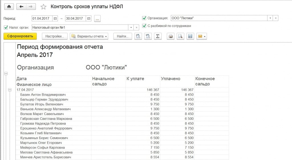Как можем заметить, отчет очень удобен, когда много межрасчетных выплат, выплат с разными сроками перечисления налога, за которыми не всегда получается проследить, особенно, когда много сотрудников. Для еще более подробного анализа данных, можно сформировать отчет по сотрудникам.