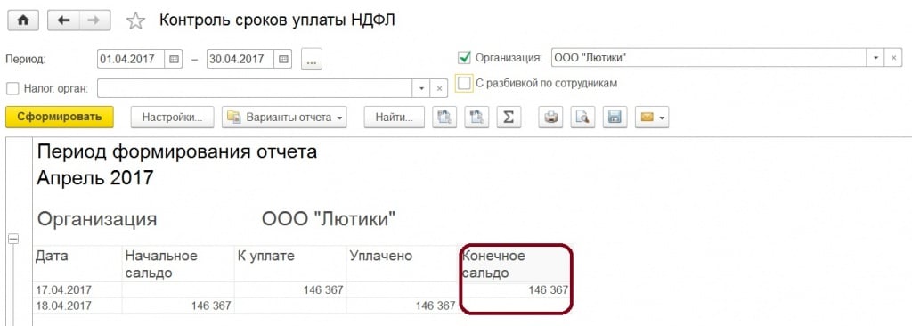Но в ведомости на выплату зарплаты стоял флажок, по перечислению налога вместе с зарплатой, поэтому получили такую картину с отрицательным конечным сальдом, то есть налог перечисли до крайнего срока.