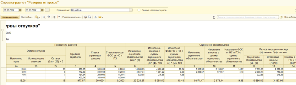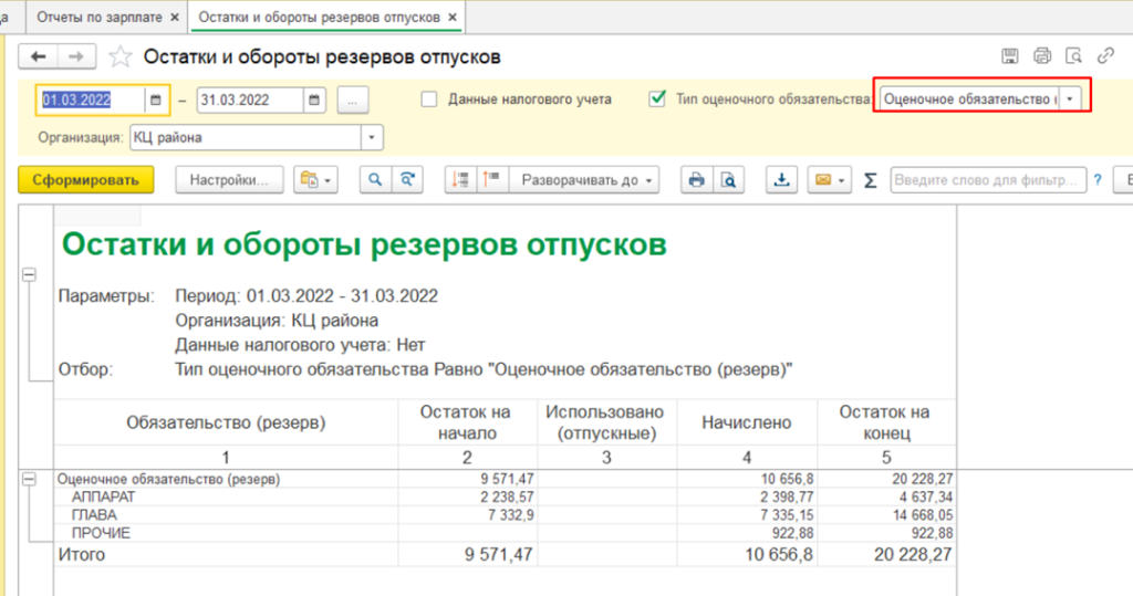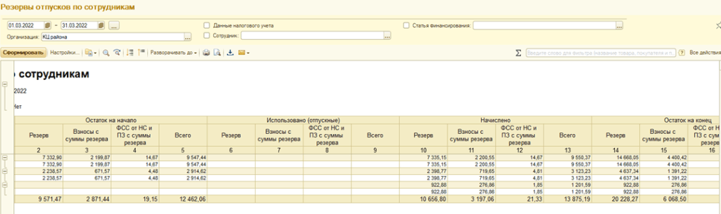 Также есть еще один отчет, который называется Остатки и обороты резерв отпусков. Он отображает информацию по сотрудникам и типам оценочных обязательств.