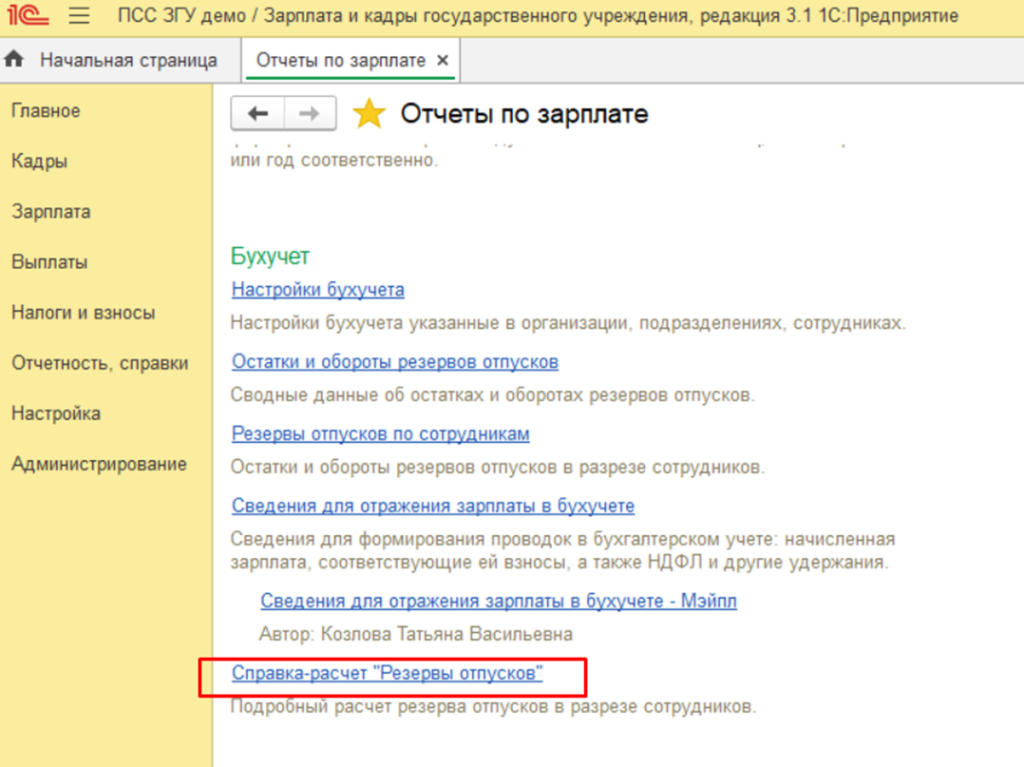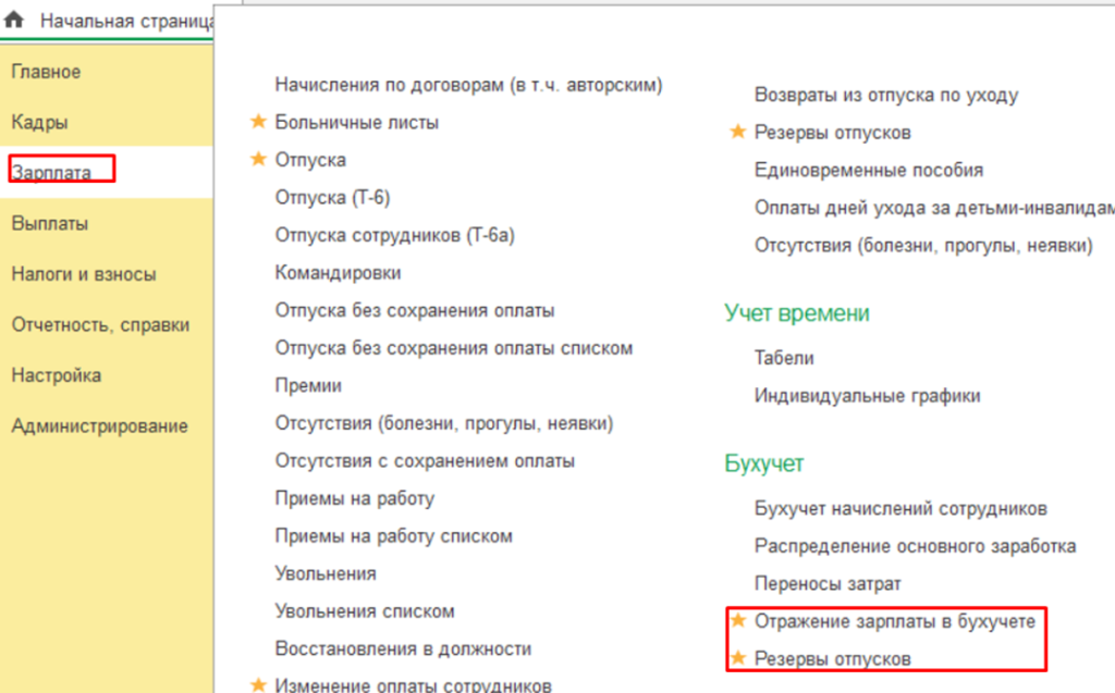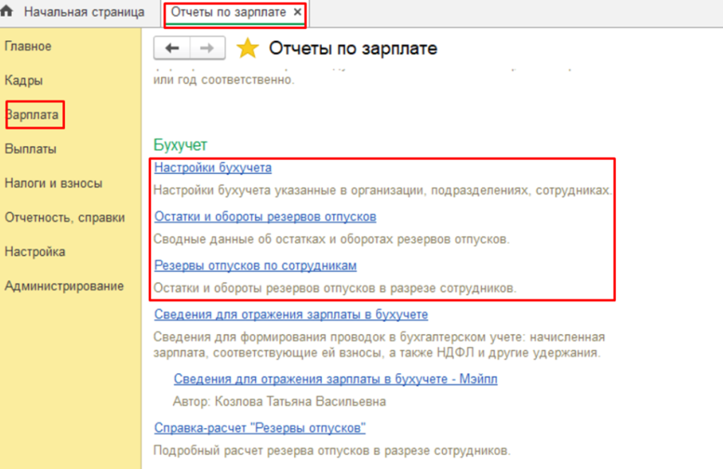 В результате настройки в разделе Зарплата у нас появилось новое меню Резервы отпусков.