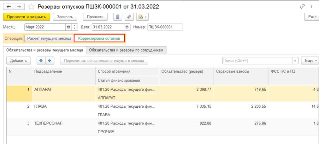 На первой закладке отображаются суммы резервов отпусков начисленных взносов по подразделениям. На второй закладке те же данные по сотрудникам. Третья закладка содержит данные остатков отпусков и размер среднего заработка, по которым рассчитывается суммы резервов и взносов во внебюджетные фонды. Закладка Корректировка остатков позволяет, при необходимости, вручную осуществить корректировки.
