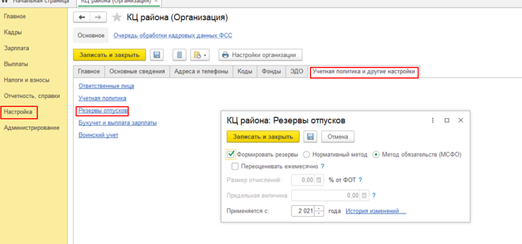 Первоначально проведем настройку. Выбираем Настройка - Реквизиты организации - Учетная политика и другие настройки - Резервы отпусков. Установим флажок Формировать резервы и отмечаем Метод обязательств (МСФО), сохраняем настройки.