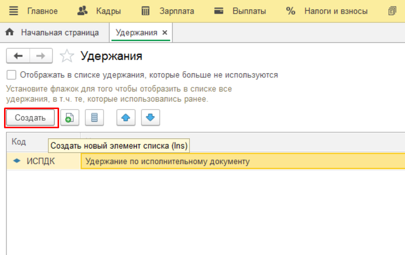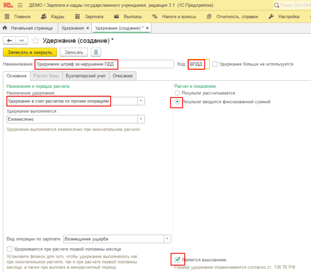 Назовем его Удержание штраф за нарушение ПДД. Проставляем необходимые параметры.