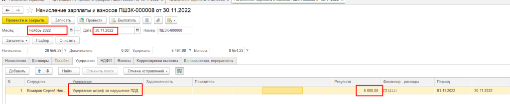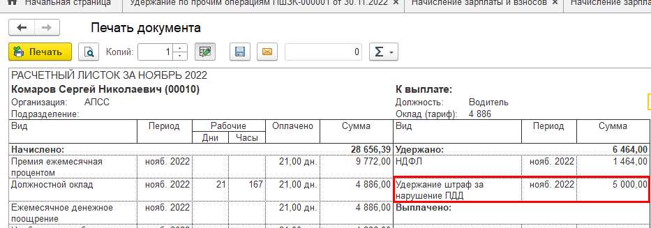 На закладке Удержания видим результат расчета Удержание штраф за нарушение ПДД в размере 5 000 руб.