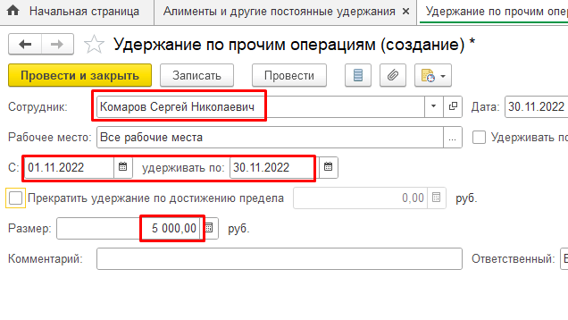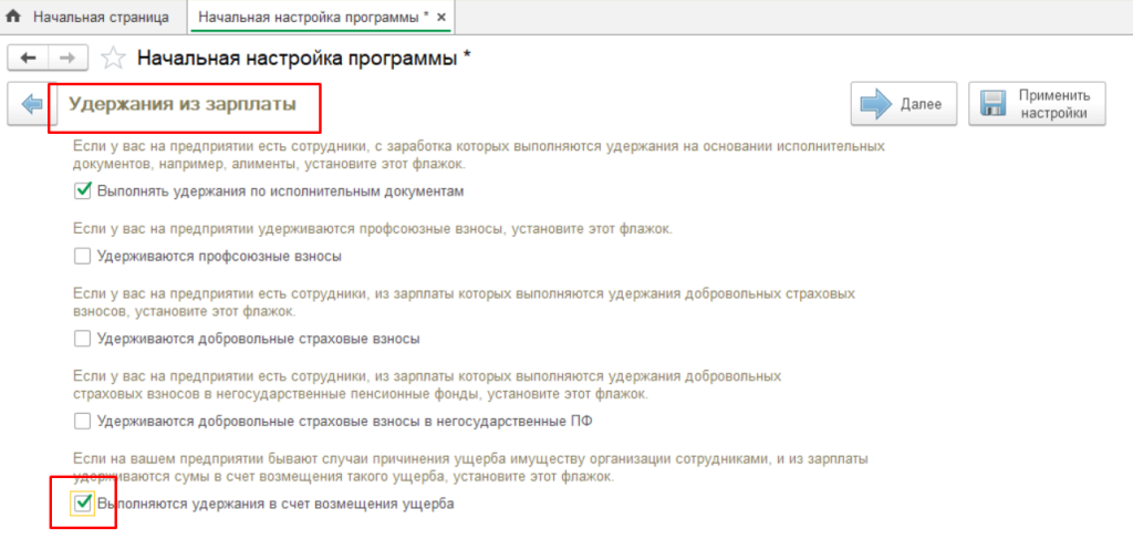 На вкладке Удержания из зарплаты включим флажок в поле Выполняются удержания в счет возмещения ущерба.