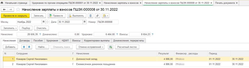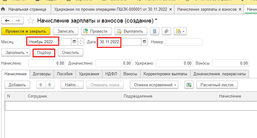 Теперь начислим сотруднику заработную плату за текущий месяц.