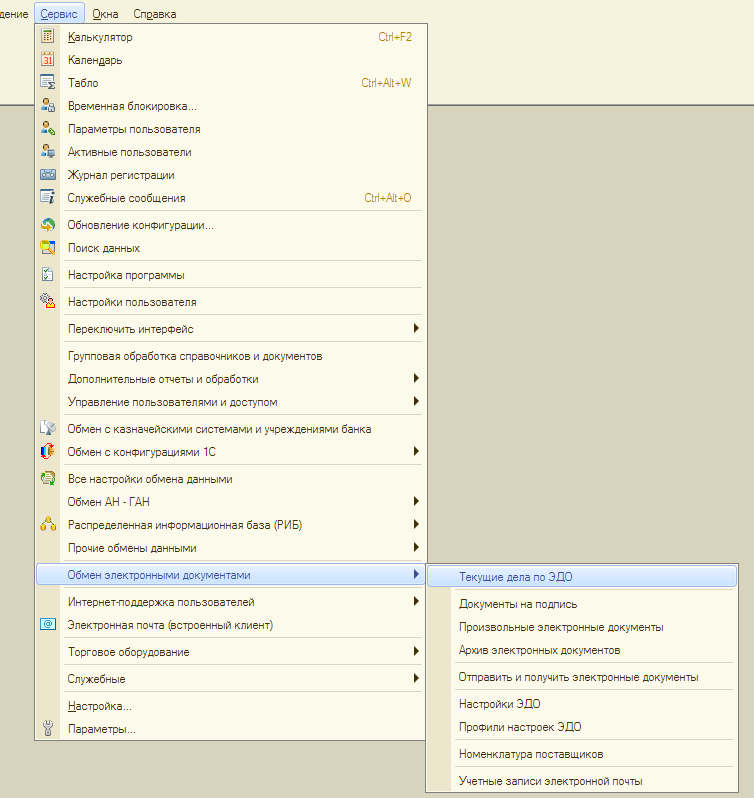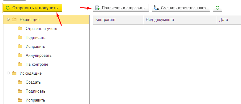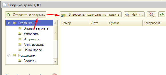 Для подписания электронных документов в редакции 1.0 выберем: Сервис - Обмен электронными документами - Текущие дела по ЭДО. Перед вами откроется небольшое окно с интерфейсом модуля ЭДО. Чтобы проверить есть ли у вас новые документы - нужно нажать «Отправить и получить», после получения документов, выбрать нужный и нажать кнопку «Утвердить, подписать и отправить».