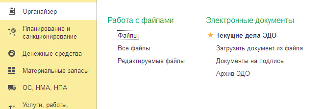 Процесс подписания документов в редакции 2.0 отличается лишь местоположением модуля ЭДО. Для доступа к модулю выберите: Органайзер - Текущие дела ЭДО, далее появится интерфейс ЭДО. Различие между первой и второй редакцией заключается в улучшенном интерфейсе, в остальном процесс получения и подписания документов остался таким же: для получения нажмите «Отправить и получить», для подписания «Подписать и отправить».
