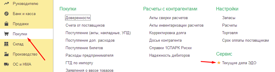 Процесс получения и подписания документов аналогичен 1С:БГУ 2.0, отличается лишь расположение самого доступа к ЭДО. Для перехода к Текущим делам ЭДО выберите: Покупки - Текущие дела ЭДО.