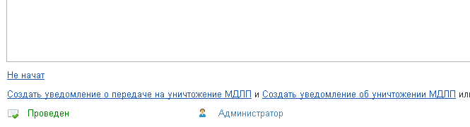 После проведения документа в нижней части программы появятся ссылки на создание уведомления о передаче на уничтожение и уведомление об уничтожении.
