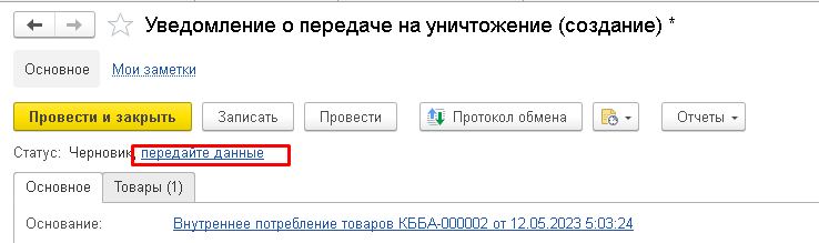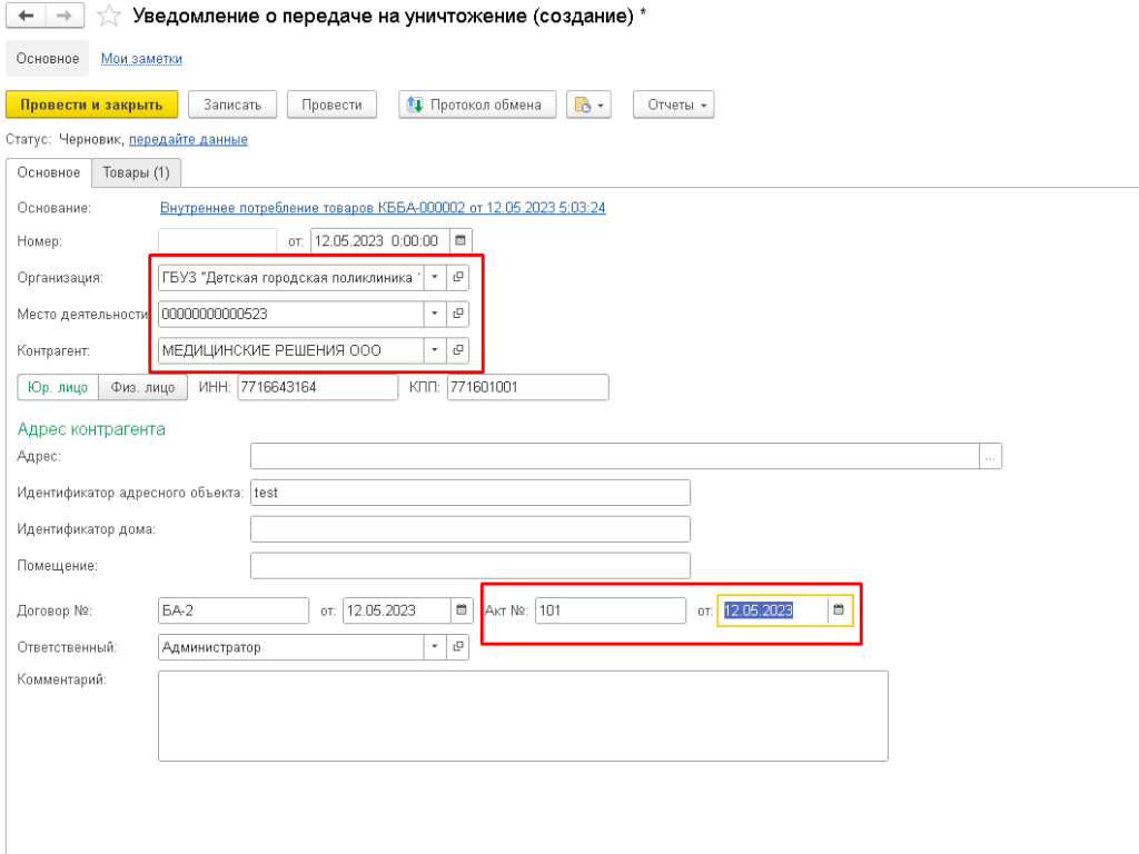 Первым создается и передается в Честный знак уведомление о передаче на уничтожение. В уведомлении необходимо указать данные организации, занимающейся уничтожением лекарственных препаратов, номер договора и акта на уничтожение. На вкладке "Товары" указывается номенклатура и перечень уникальных идентификаторов вторичной упаковки, переданных на уничтожение.