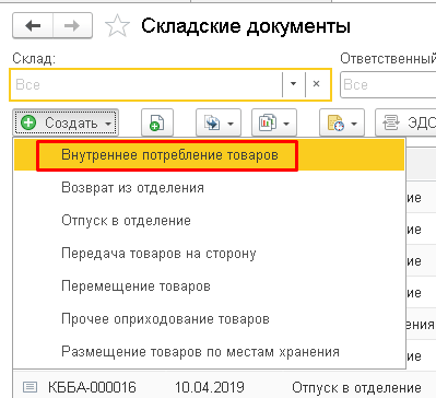 В Складских документах по кнопке «Создать» будет выдано несколько видов, выберем «Внутреннее потребление товаров».