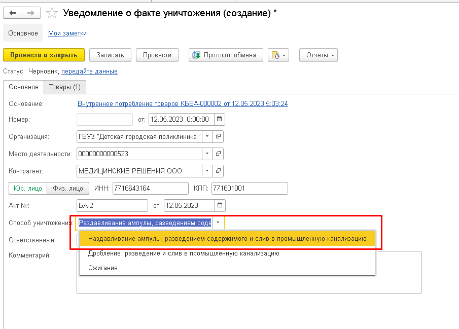 После выполнения обмена в 1С:МДЛП, в базу появится ответ, на основании которого создаем уведомление об уничтожении. При фактическом уничтожении лекарственного препарата, после получения акта об уничтожении, необходимо оформить уведомление о факте уничтожения, указав способ уничтожения.