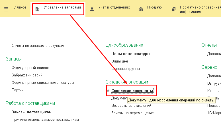 Уведомление о передаче на уничтожение можно оформить на основании документа Внутреннее потребление товаров. Документ оформляется отдельно по каждому складу отделения. Для создания документа необходимо выбрать Управление запасами — Складские документы.