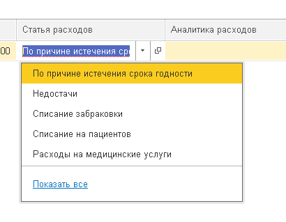 В поле «Статья расходов» выберем соответствующую позицию: «По причине истечения срока годности» или «Уничтожение».
