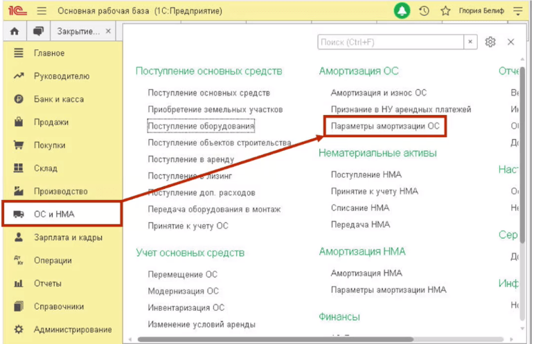 В разделе ОС и НМА переходим по ссылке «Параметры амортизации ОС» и по кнопке «Создать» выбираем документ «Изменение элементов амортизации ОС» (в прошлых версиях - «Изменение параметров амортизации ОС»).