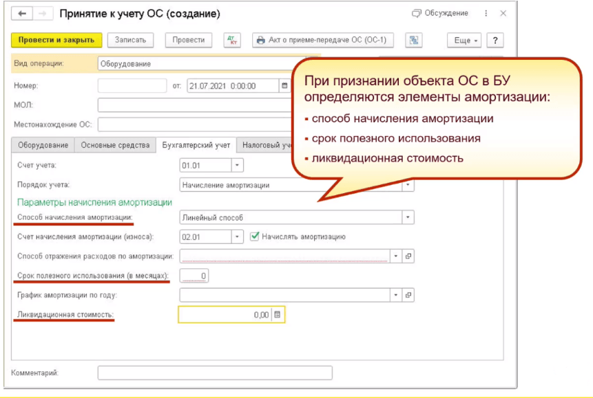 После включения установления изменений о досрочном применении появляется возможность в документе «Принятия к учету ОС» указывать ликвидационную стоимость.