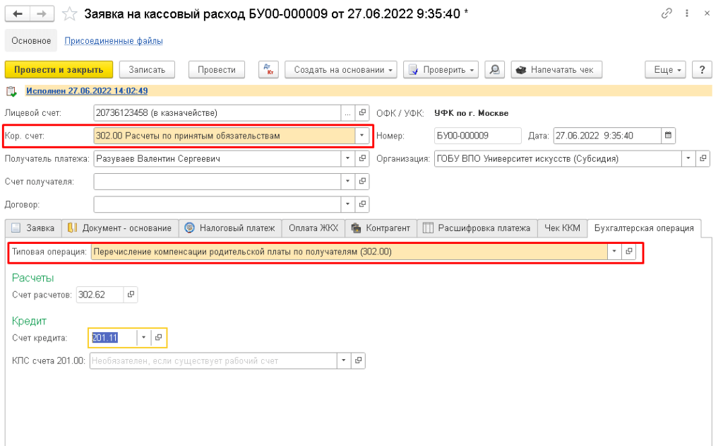 Нередко возникает ситуация, когда Заявка провелась, но бухгалтерские проводки не сформировались, тогда следует проверить, выбран ли Корреспондентский счет и Типовая операция.