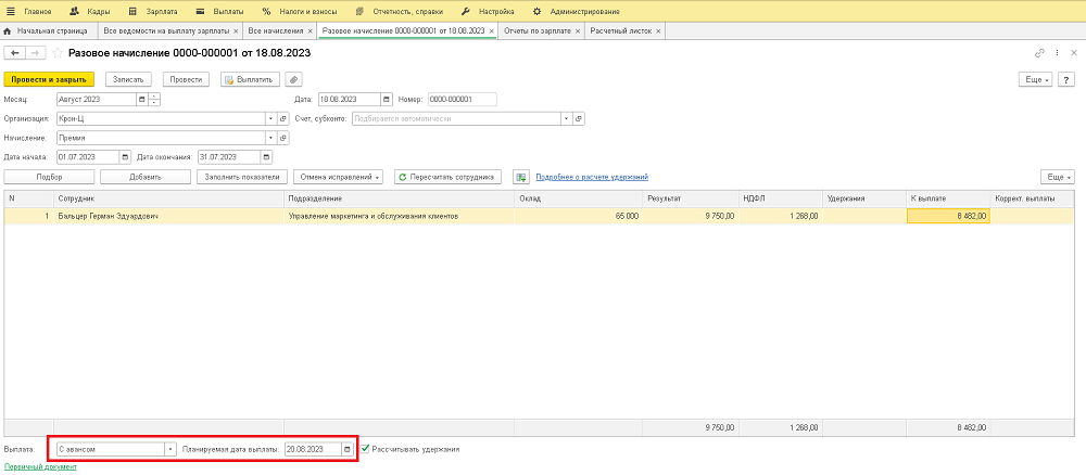 3. Рассмотрим случаи, когда с авансом организация выплачивает какое-либо разовое начисление, а эта сумма в ведомость на аванс не попадает.