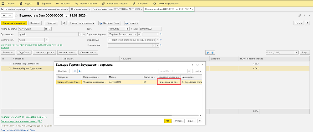 1. Первой причиной отсутствия сотрудника в ведомости на аванс может быть проведенный документ «Начисление зарплаты и взносов».
