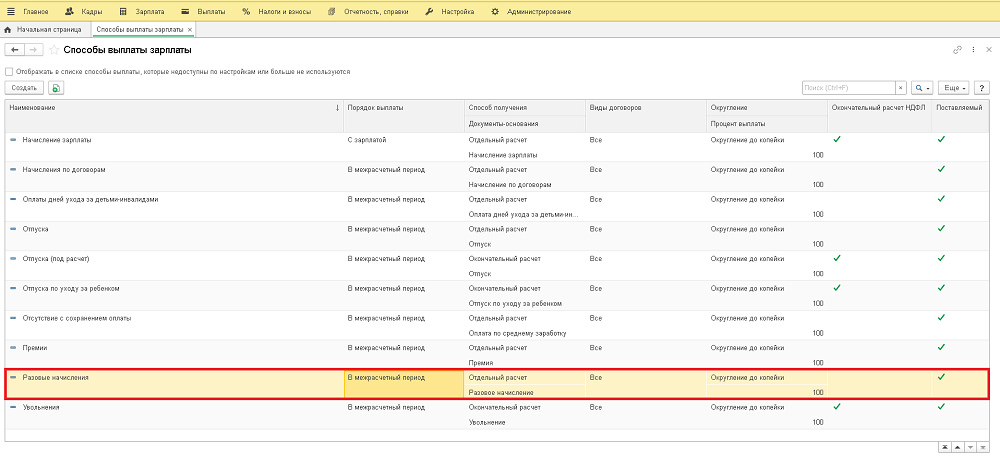 Далее переходим в настройки способов выплаты (Раздел «Настройка» - Предприятие - Способы выплаты зарплаты). В нашем случае, для разового начисления, порядок выплаты указан «в межрасчетный период», следовательно, выплата с авансом при такой настройке невозможна.