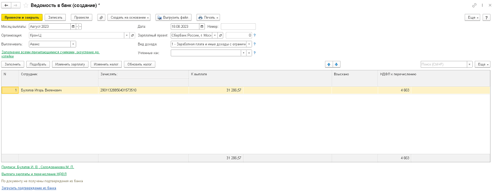 После отмены проведения этого документа сотрудник попадает в ведомость на выплату аванса.
