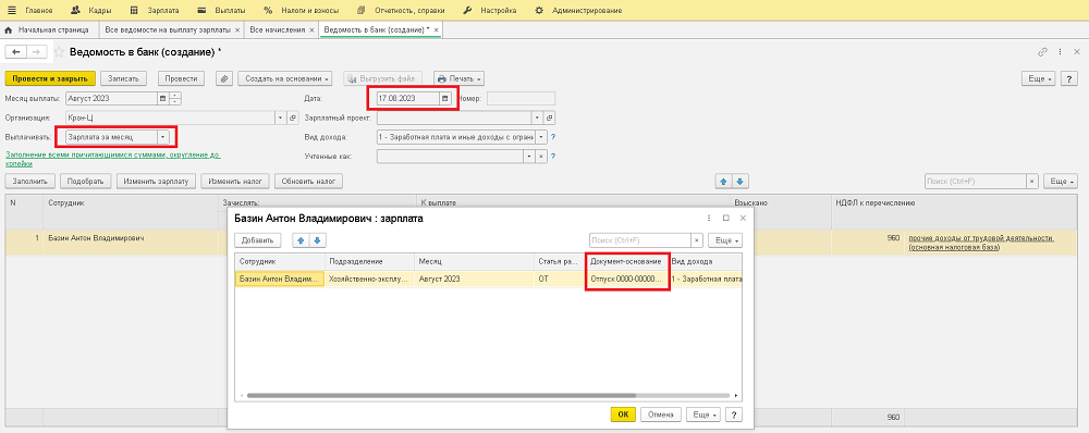 2. Вторая причина заключается в том, что до выплаты аванса была проведена ведомость с видом выплаты «Зарплата за месяц». Если в этом документе нет сумм самой зарплаты, а, например, премия или отпуск, то все равно в ведомость на аванс такой сотрудник попадать не будет. Поэтому в данном случае решением может быть временная отмена проведения ведомости с видом выплаты «Зарплата за месяц», проведение ведомости на аванс и проведение ведомости с видом выплаты «Зарплата за месяц».