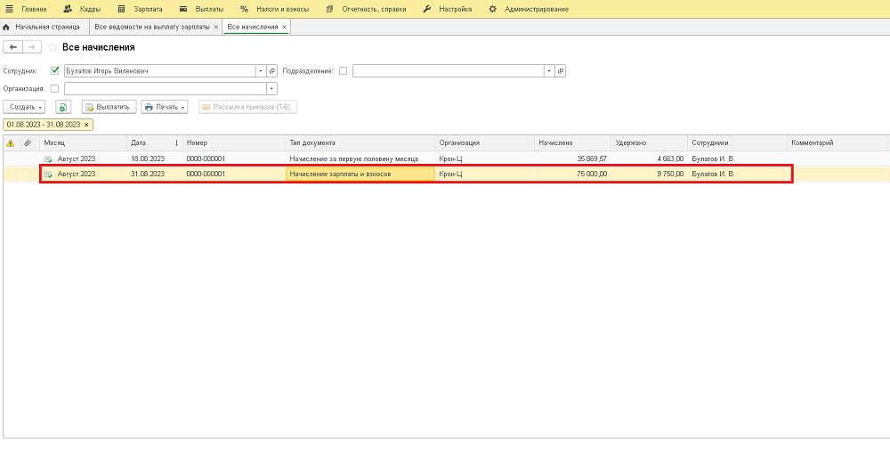 Для начала проверим не был ли проведен документ «Начисление зарплаты и взносов». Из рисунка видно, что по сотруднику был проведен окончательный расчет за месяц.