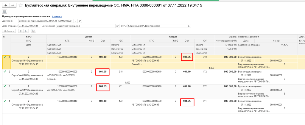 Мы видим выбытие АВТОМОБИЛЯ УАЗ-220695 со счета 101.35 «Транспортные средства – иное движимое имущество учреждения» и поступление на счет 101.25 «Транспортные средства – особо ценное движимое имущество учреждения». А также проводки по амортизации основных средств.