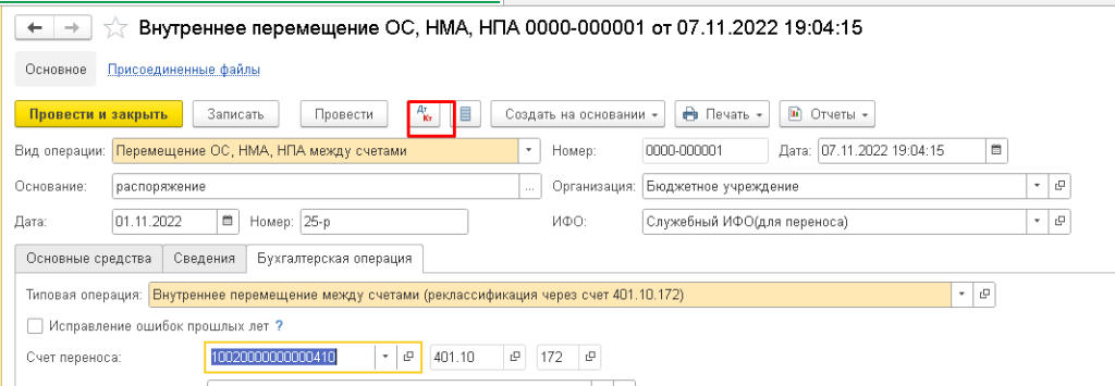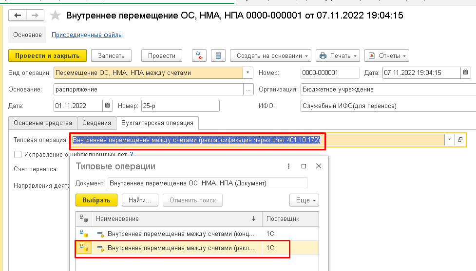 На вкладке Бухгалтерская операция в поле Типовая операция выбираем Внутреннее перемещение между счетами (реклассификация через счет 401.10.172).