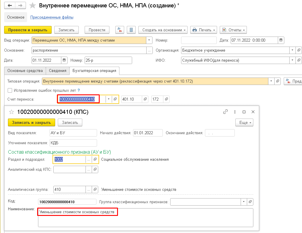 Указываем КПС счета 401.10 Уменьшение стоимости основных средств и проводим документ.