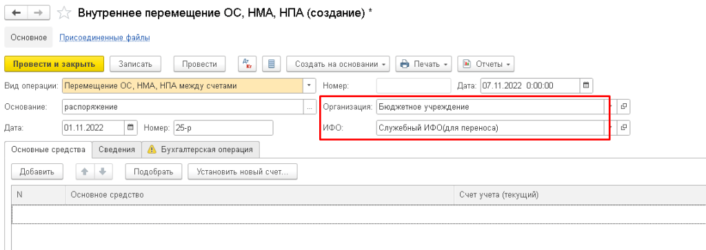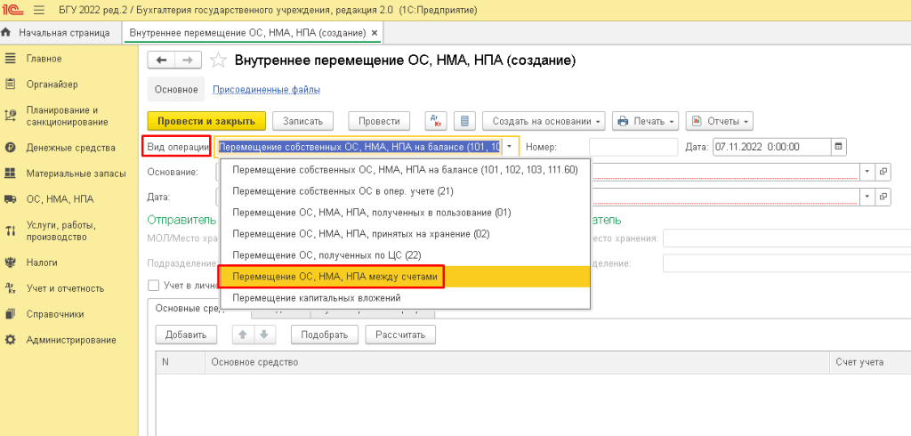 Создаем документ. В поле Вид операции выбираем Перемещение ОС, НМА, НПА между счетами.