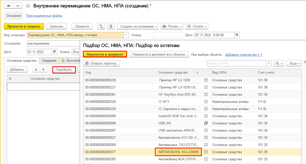 Далее через кнопку Подобрать, выбираем нужное основное средство - АВТОМОБИЛЬ УАЗ-220695 и переносим его в табличную часть документа.