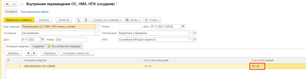 Необходимо перенести основное средство - АВТОМОБИЛЬ УАЗ-220695 со счета 101.35 «Транспортные средства – иное движимое имущество учреждения» на счет 101.25 «Транспортные средства – особо ценное движимое имущество учреждения» на основании распоряжения руководителя бюджетного учреждения. Стоимость основного средства 800 000 руб., количество 1 единица.