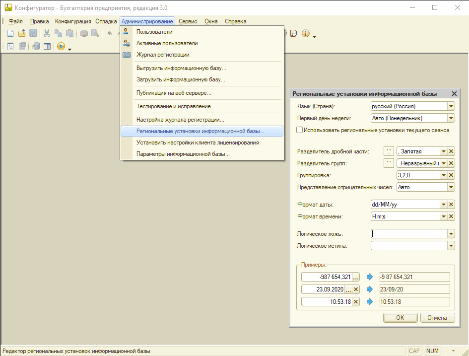 4. По кнопке "F5" сохраните выбранные настройки и обновите информационную базу. Заданные региональные установки будут действовать для всех пользователей, которые подключатся к информационной базе.