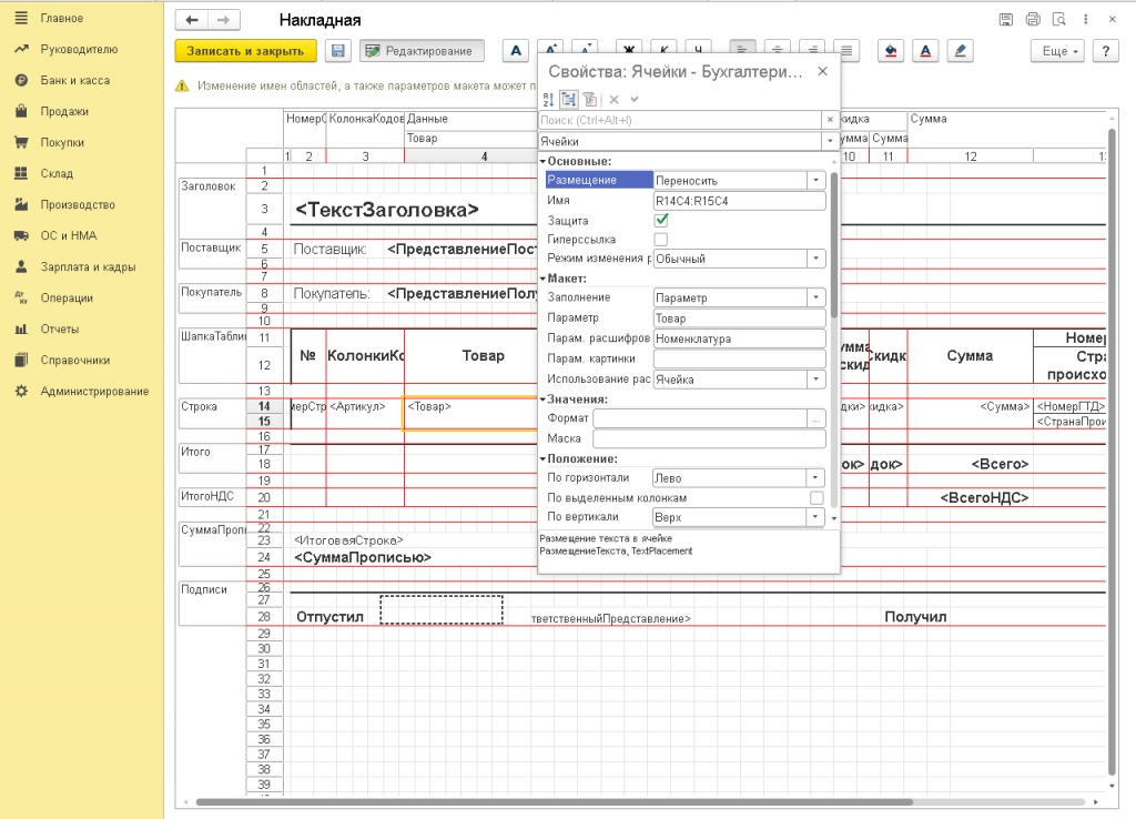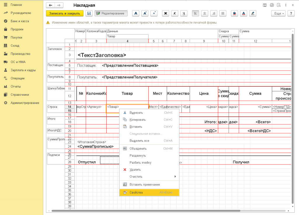 С помощью изменения параметра в макете документа возможно поменять значения для документа. Например, для того чтобы в ячейку выводилась цена, артикул или товар, нужно просто указать необходимый параметр в ячейке. Для просмотра настроек необходимой ячейки, нужно нажать на нее правой кнопкой мыши и выбрать «Свойства».